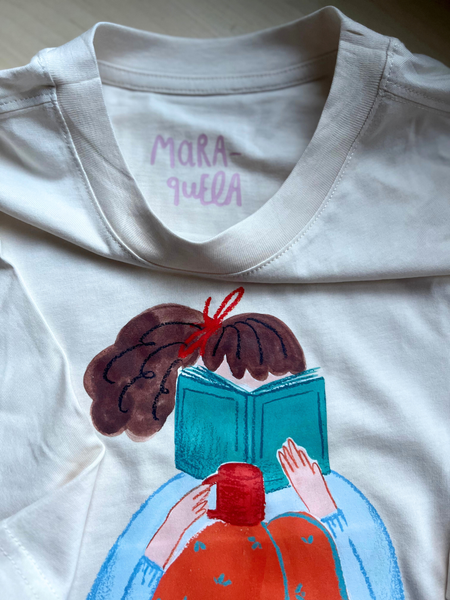 Camiseta blanca off-white con una ilustración vibrante creada a partir de uno de mis sketches más especiales sobre la lectura y la pasión por los libros.