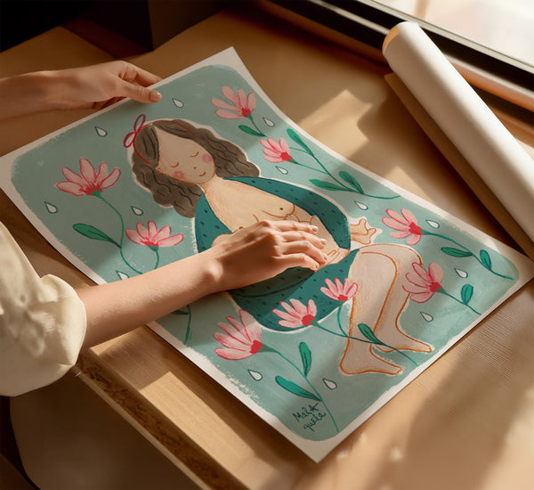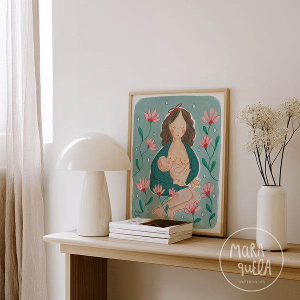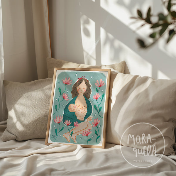 Esta ilustración de una madre amamantando celebra la belleza real y cotidiana de la lactancia. Con un estilo suave y emotivo, aporta armonía y significado a cualquier espacio: el dormitorio, el rincón de lactancia o ese lugar donde te gusta parar y respirar.