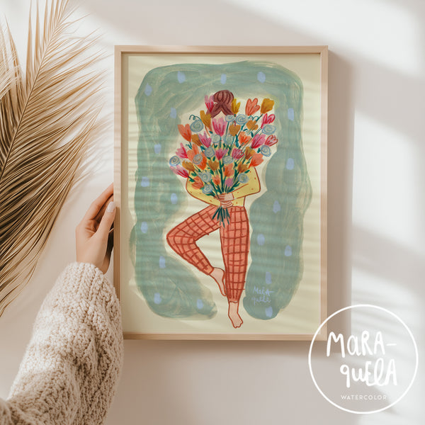Lámina de mujer con flores en equilibrio entre el cuerpo y el alma.