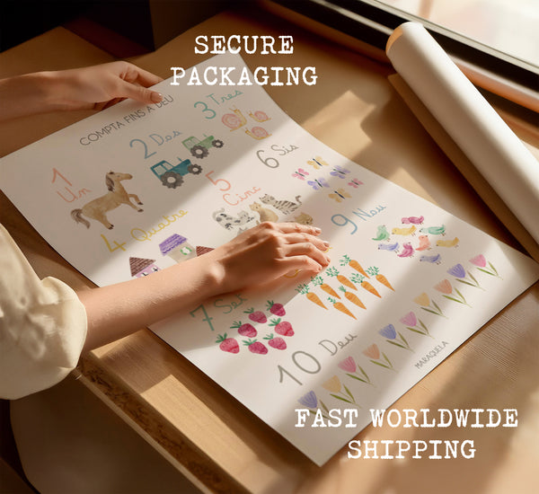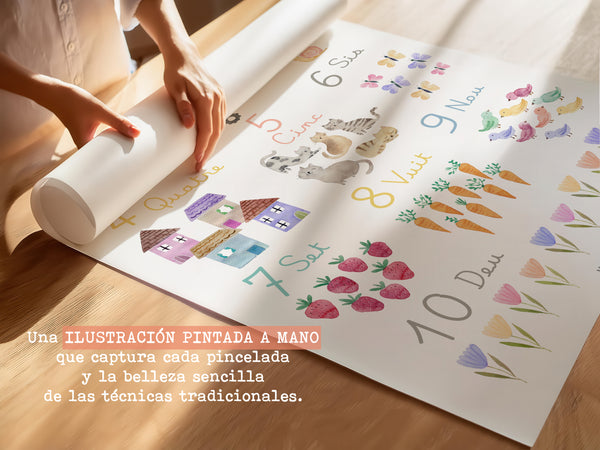 A través de ilustraciones en acuarela de animales y objetos cercanos a su mundo, esta lámina ayuda a familiarizarse con los números mientras estimula el vocabulario, la curiosidad y el descubrimiento del entorno. Aprender a contar puede ser tranquilo, agradable y sin prisas ✨