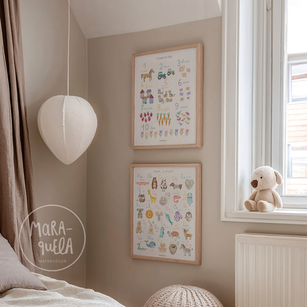 En cuanto al tamaño de estas láminas de números y abecedario en castellano, aconsejo el formato superior (50x70cm), ya que fueron pensadas y diseñadas para estos formatos y pueden apreciarse mucho mejor los detalles de cada una de los elementos que la componen.