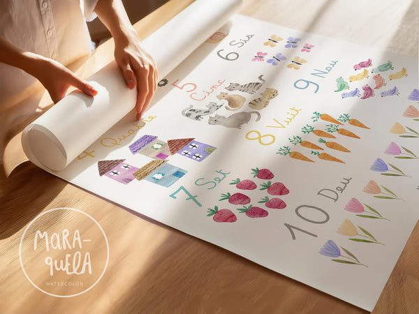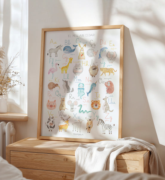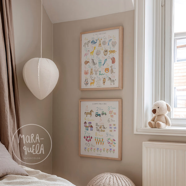 En cuanto al tamaño, para las láminas de números y abecedario en catalán recomiendo el formato grande 50×70 cm, ya que fueron pensadas para este tamaño y permiten apreciar mucho mejor cada detalle, textura y pincelada.